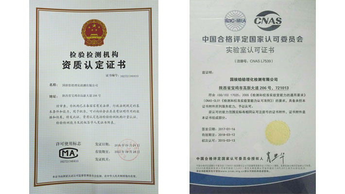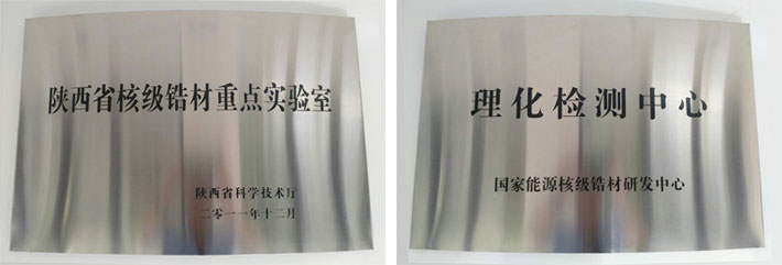 2010年1月6日,公司前身獲得國家能源局頒發的“國家能源核級鋯材研發中心”稱號;2011年12月,獲得陜西省科學技術廳頒發的“陜西省核級鋯材重點實驗室”稱號;2013年5月,獲得CMA資質;2015年3月31日,獲得CNAS資質;2016年變更法人和名稱后,又分別取得了CMA和CNAS資質。