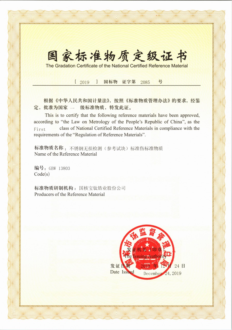 近日,國核鋯業(yè)取得了由國家市場監(jiān)督管理總局頒發(fā)的“鈦和不銹鋼無損檢測(參考試塊)標準傷標準物質”兩項國家一級標準物質定級證書。國家一級標準物質資質在全國范圍內(nèi)僅授權國核鋯業(yè),標志著公司無損檢測人工傷制備技術代表了國家能力,達到了國內(nèi)最高水平。