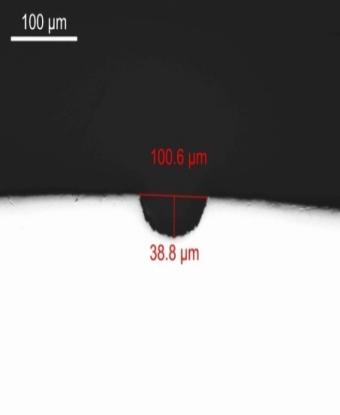 在管材的生產(chǎn)過程中,需要采用超聲檢測對產(chǎn)品進行檢驗,以剔除不滿足要求的管材。而確定產(chǎn)品是否合格的標準,是通過在管材上制作規(guī)定尺寸特征量值的人工槽型標準傷,進行超聲設備靈敏度調(diào)試,確定檢驗標準。檢測中將缺陷所產(chǎn)生的反應幅度與人工槽型標準傷產(chǎn)生的反應幅度進行比較,如果低于人工槽型標準傷反應幅度,產(chǎn)品將判定為合格而放行。人工槽型標準傷是判定產(chǎn)品是否合格的主要依據(jù)和判定標準,其尺寸精度至關重要,直接影響產(chǎn)品檢驗結果。在無損檢測過程中主要以長度、寬度和深度來表征人工槽型標準傷的特性量值。人工槽型標準傷一般在管材的內(nèi)外表面加工,圖1為公司加工的無損檢測人工槽型標準傷的3D成像圖,垂直于人工槽型標準傷長度方向的截面圖如圖2所示。由圖可以看出加工出的人工槽型標準傷規(guī)整、對稱,為典型的U型形狀。