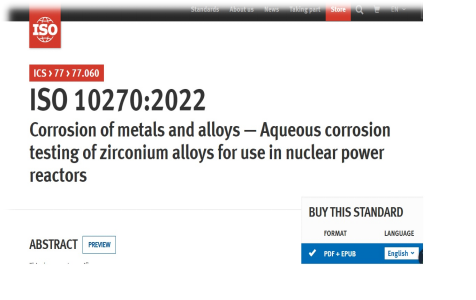 2月9日,由國核鋯業主導制修訂的國際標準ISO10270:2022《金屬和合金腐蝕-核反應堆用鋯合金水溶液腐蝕試驗》由國際標準化組織(ISO)正式發布。該標準是我國核電用鋯材檢測領域首個正式發布的ISO國際標準,實現了歷史性突破,對推動我國和國際核級鋯材材料和評價水平整體發展及核材料檢驗技術提升具有重大意義。