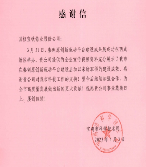 近日,公司收到一封來自寶雞市科學技術局的感謝信,充分肯定了公司在“秦創(chuàng)原創(chuàng)新驅(qū)動平臺”建設成果方面做出的努力。