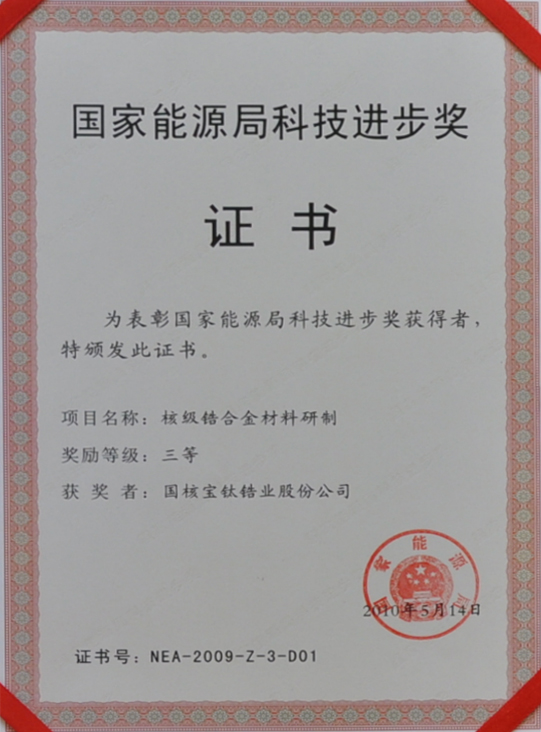 國核寶鈦鋯業股份公司《核級鋯合金材料研制》獲2009年度國家能源局科技進步三等獎