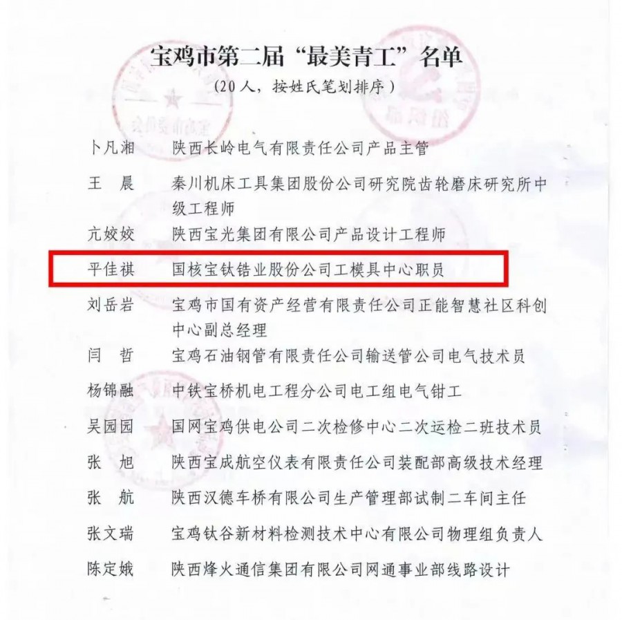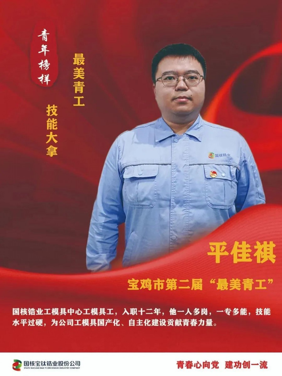 今年五四青年節,國核鋯業平佳祺獲得寶雞市第二屆“最美青工”榮譽稱號。